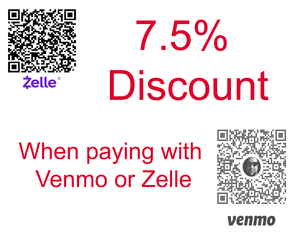 7.5% Discount for Zelle or Venmo payment using code: CASH at check out.